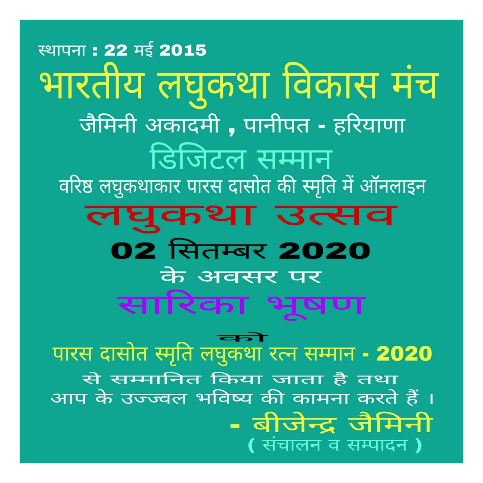 भारतीय लघुकथा विकास मंच ने वरिष्ठ लघुकथाकार पारस दासोत की स्मृति में ऑनलाइन " लघुकथा उत्सव " आयोजन रखा है ।