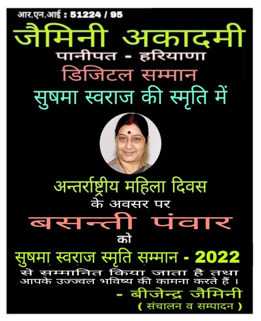 जैमिनी अकादमी द्वारा अन्तर्राष्ट्रीय महिला दिवस के अवसर पर सुषमा स्वराज की स्मृति में डिजिटल सम्मान समारोह का आयोजन किया है .